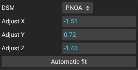 Comme le nuage de points MNS et l’image aérienne proviennent de sources différentes, ils peuvent présenter un léger décalage. Pour les aligner, vous pouvez utiliser les contrôleurs d’ajustement X, Y et Z (X et Y pour l’alignement horizontal avec l’image aérienne, et Z pour l’alignement vertical avec la référence du sol) :